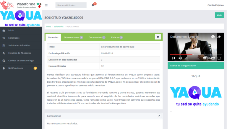 La plataforma de gestión de solicitudes de atención legal facilita la colaboración entre las instituciones que requieren asistencia jurídica y los estudios jurídicos que ofrecen servicios pro bono. Los abogados acceden a la información y eligen atender los casos que les interesen, generando un convenio de servicio que debe ser aceptado para proceder con la atención.