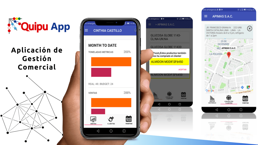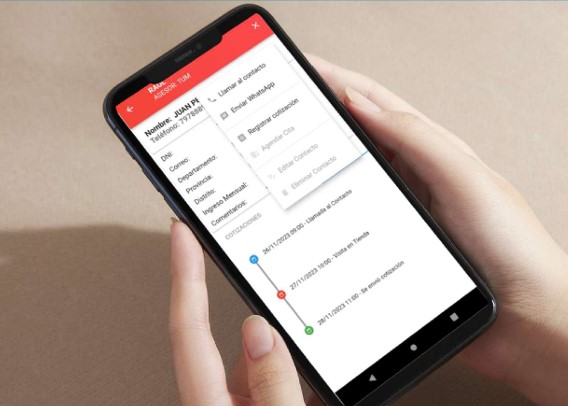 Los vendedores pueden cotizar, programar y ejecutar llamadas, enviar mensajes de WhatsApp y registrar visitas directamente desde el aplicativo.